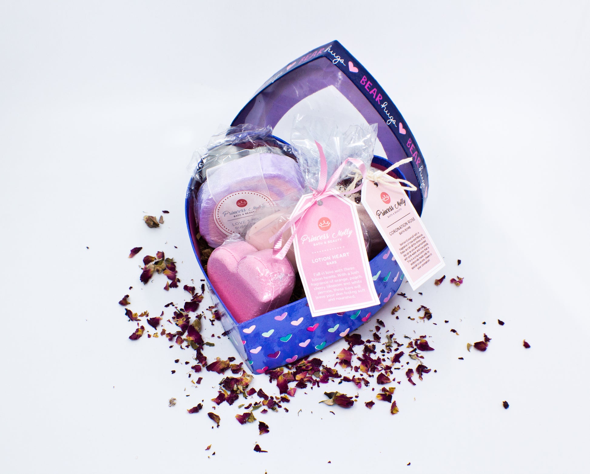Included in this set- 1 coronation rose bath bomb, 1 love spell bath bomb heart, 1 pack of lotion hearts with a metal tin, and 1 love spell bubble bar.