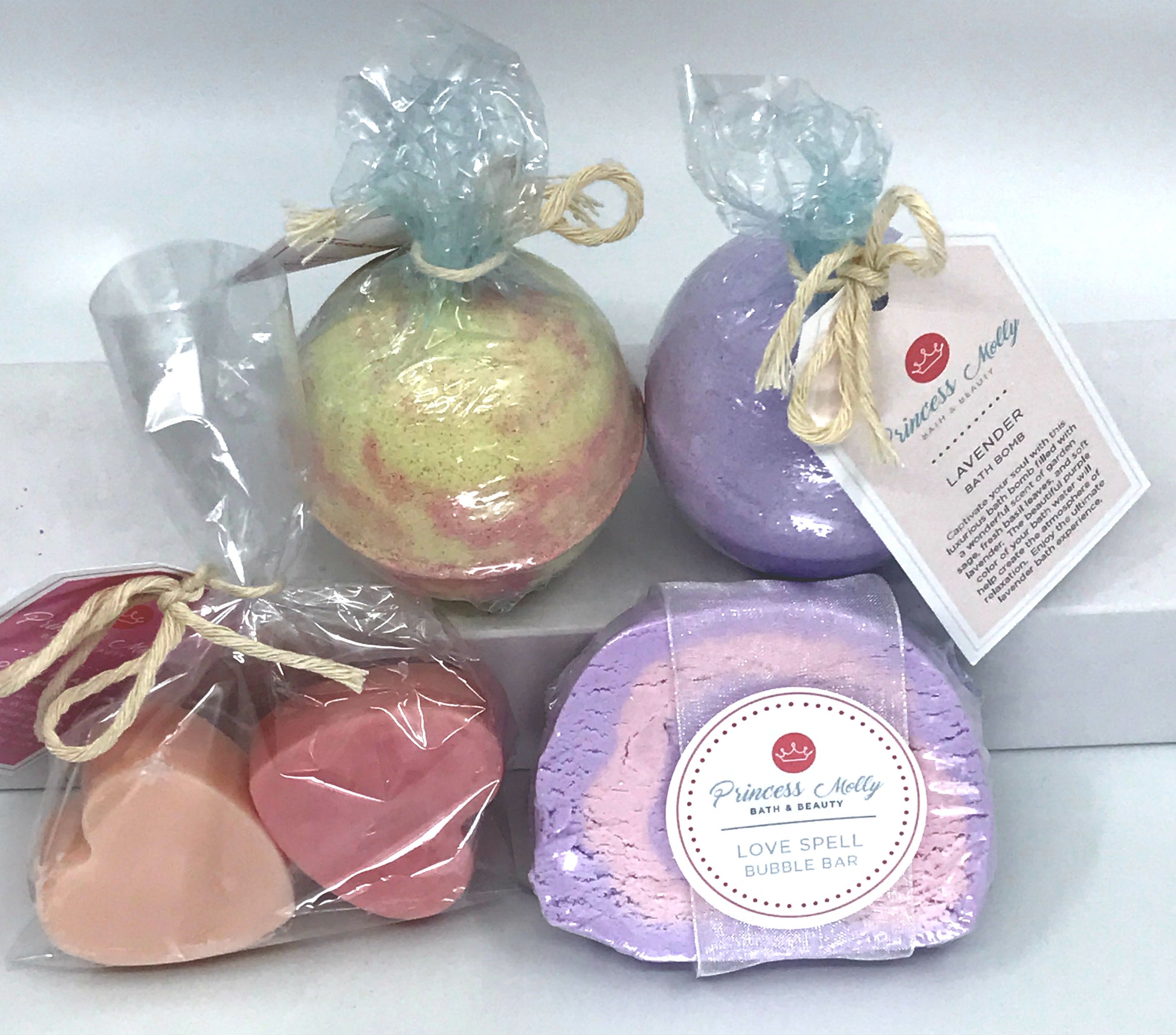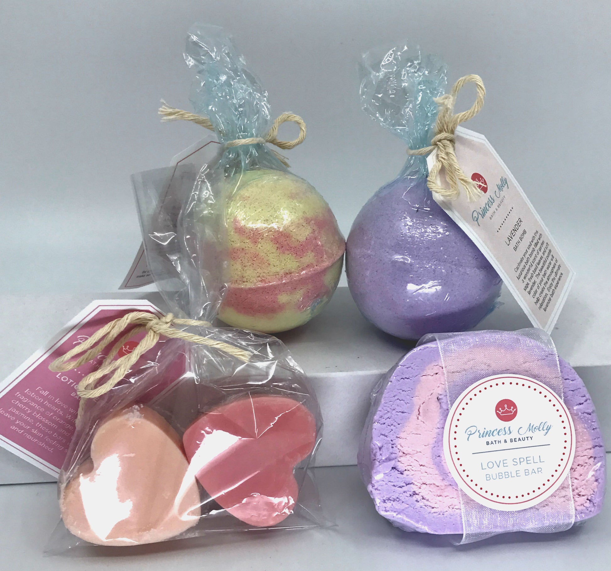 This adorable bag is the perfect assortment of bath products for any princess. This bag has a little bit of everything including 2 bath bombs of your choice, a Love Spell Bubble Cake, and a pack of our signature lotion hearts.